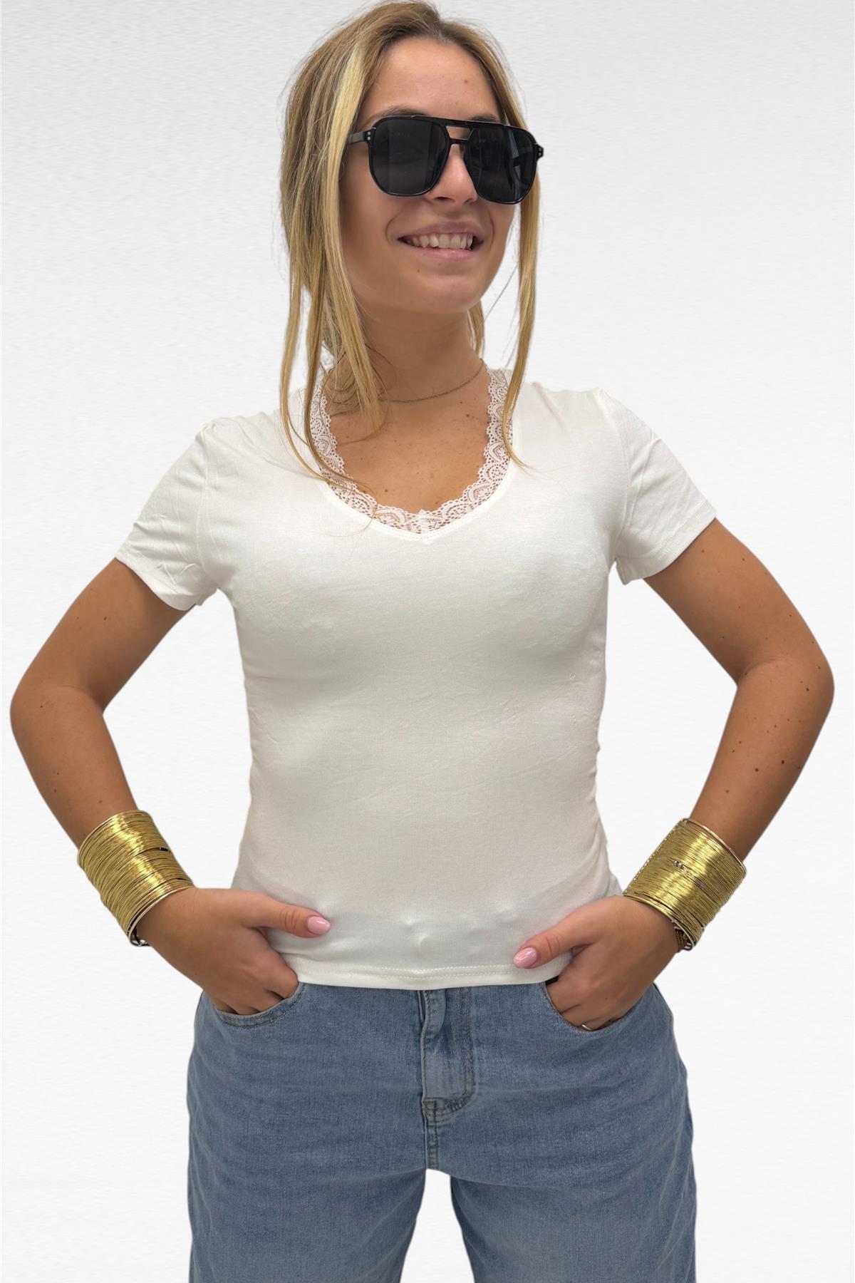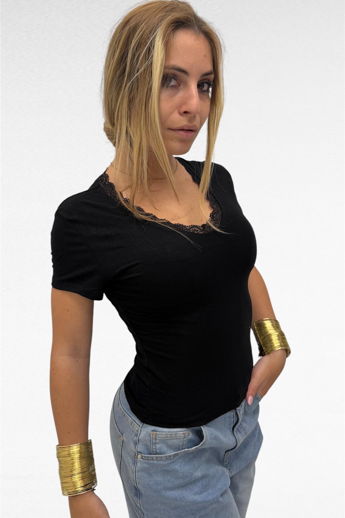 Maglia elasticizzata con scollo a V e dettagli in pizzo sullo scollo