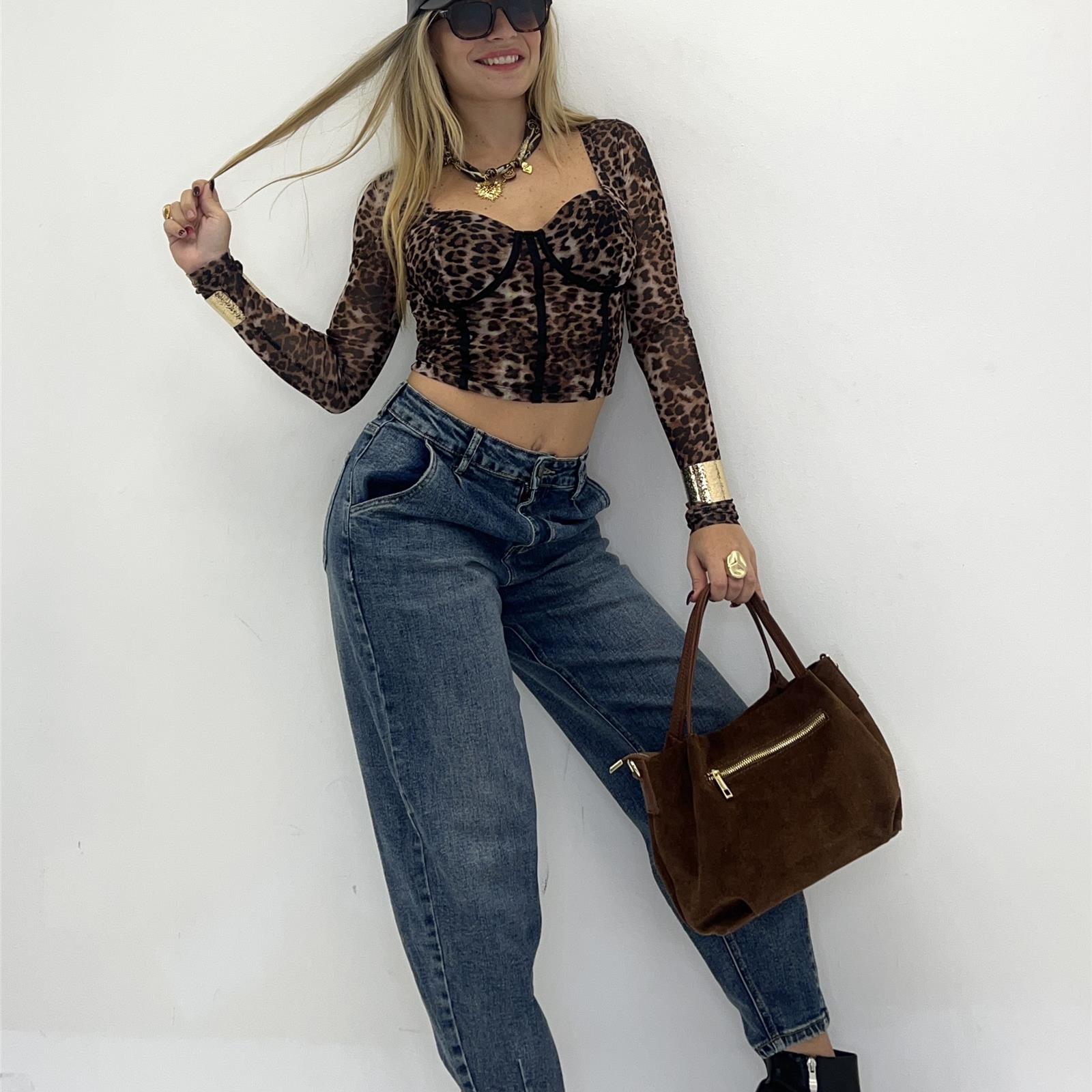 Maglia corsetto in tessuto mesh con stampa leopardata con manica lunga e coppa imbottita