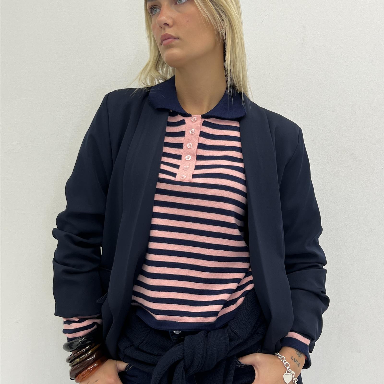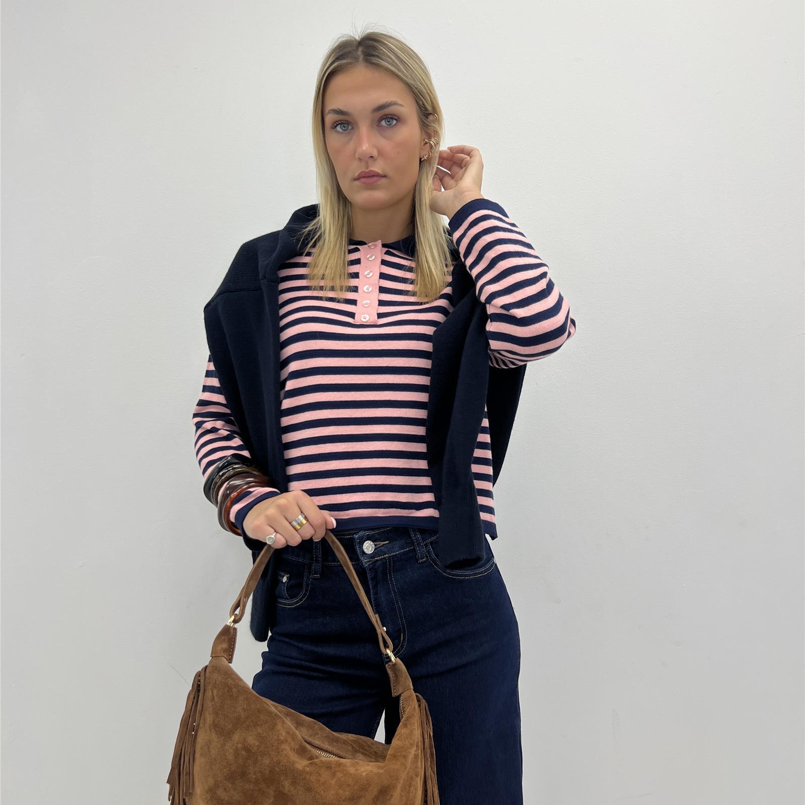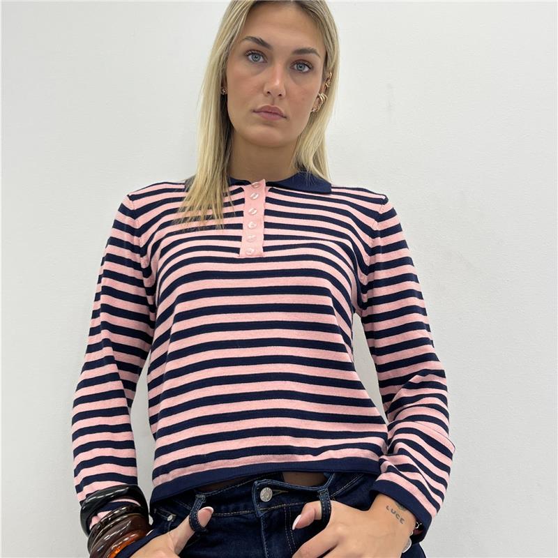 Maglia polo con colletto, manica lunga , bottoni sul davanti e righe a contrasto