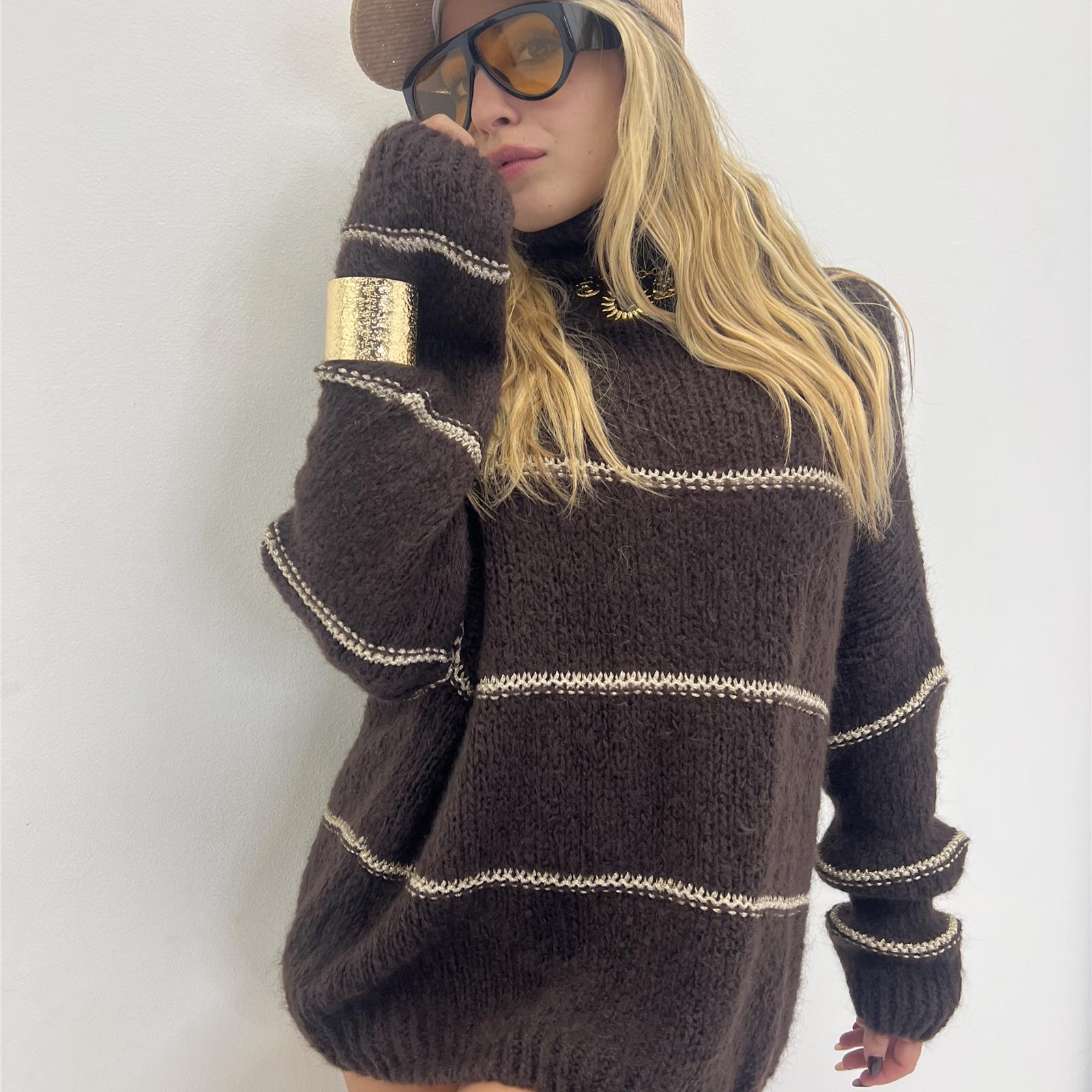 Maglione con collo ad anello, over , con ricami dorati che creano linee sull parte frontale, sul retro e sulle maniche
