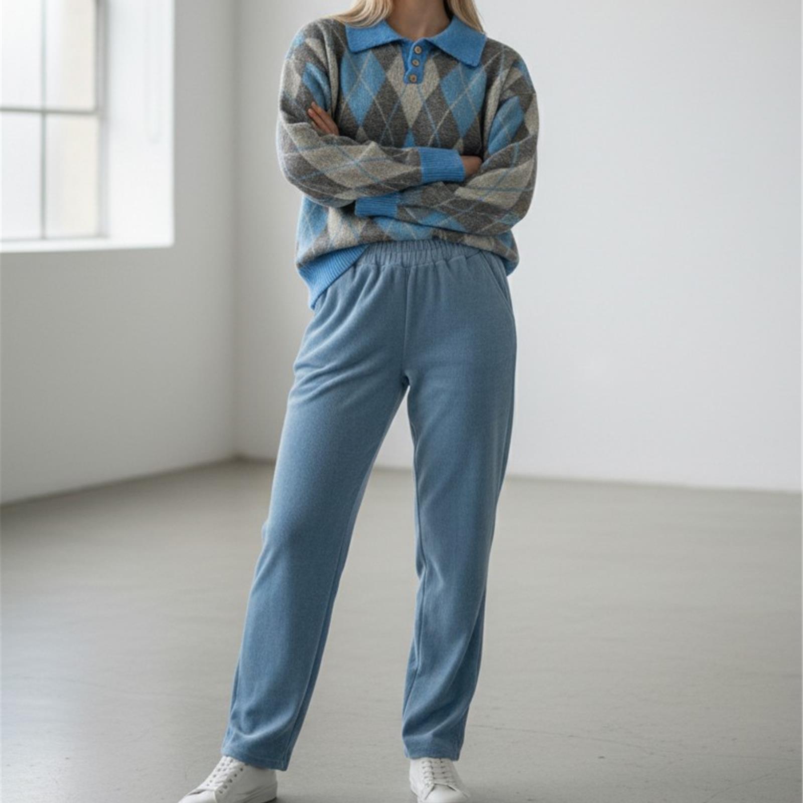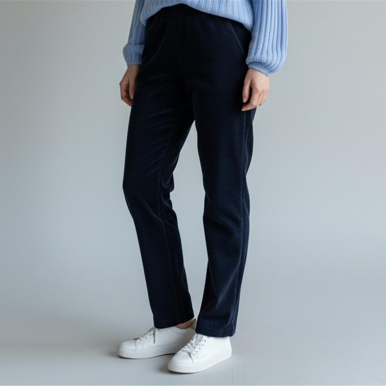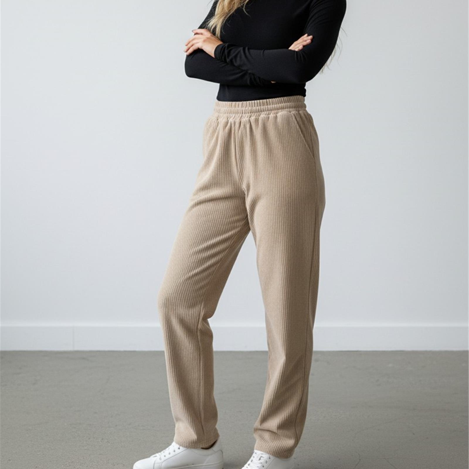 Pantalone in velluto costina stretta modello jogger con tasche laterali, vita elasticizzata (senza zip né bottone), gamba dritta.