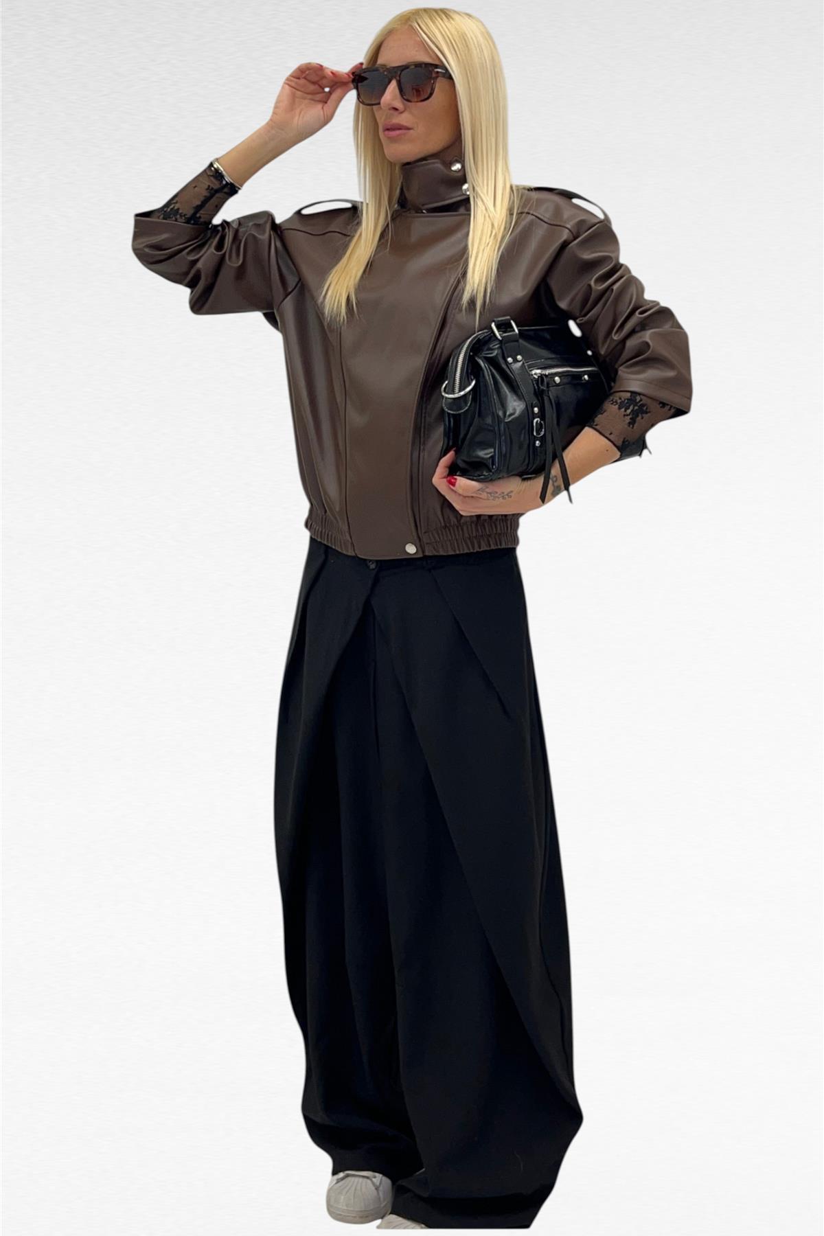 Pantalone con chiusura incrociata a doppio bottone e zip di chiusura, pence frontali con tasche laterali e gamba ampia.
