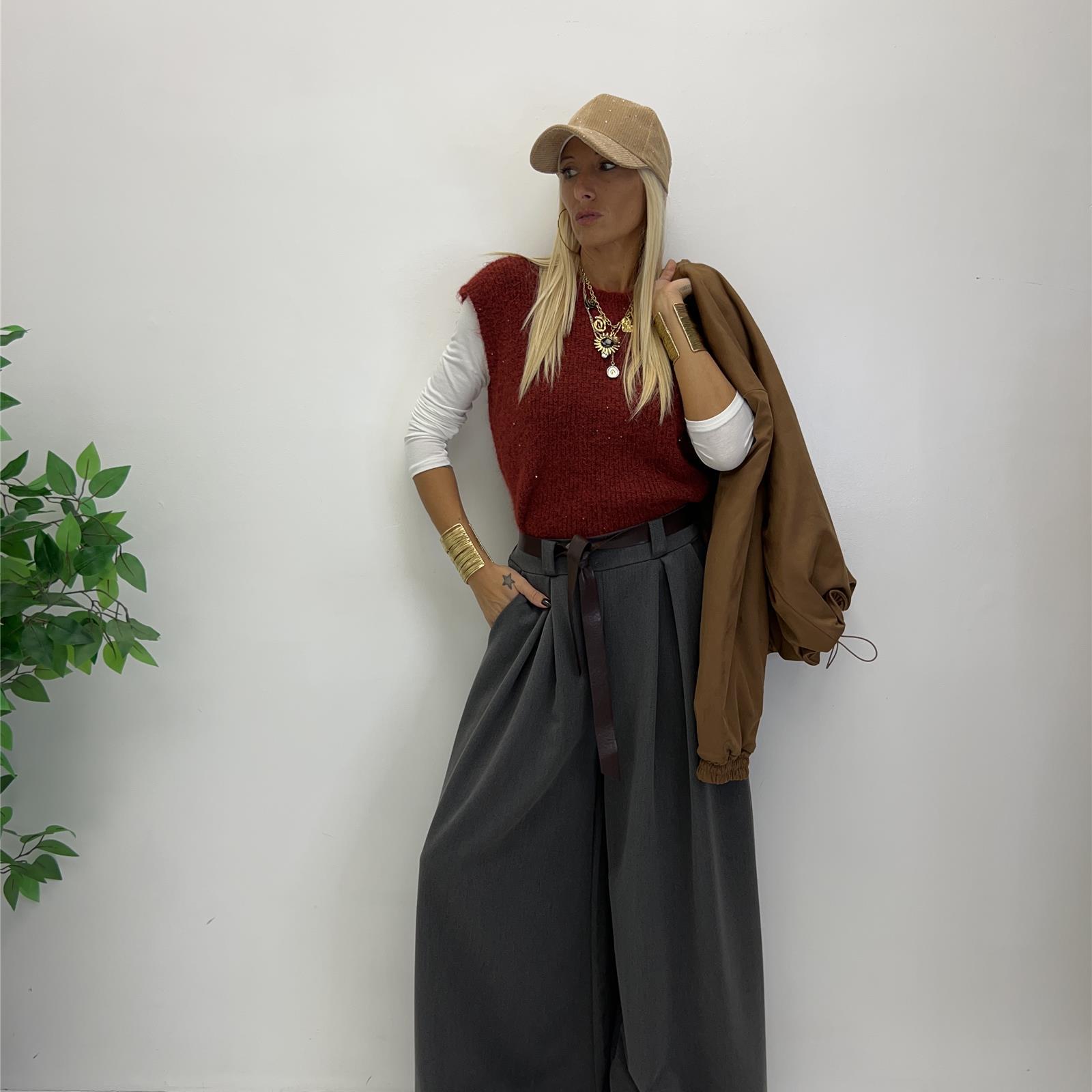 Pantalone molto ampio modello pantagonna con tasche e cintura elastico in vita sul retro bottone di chiusura