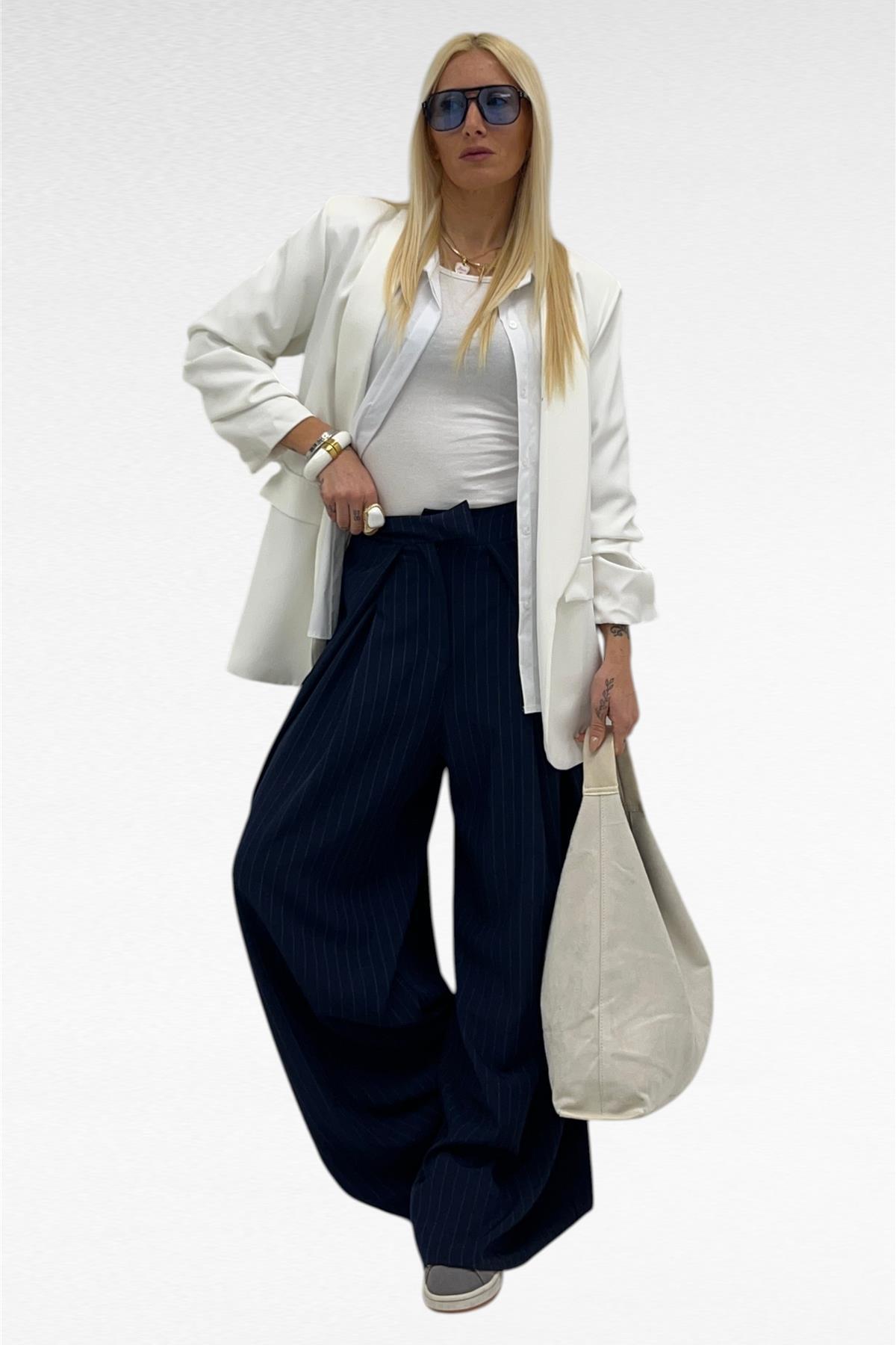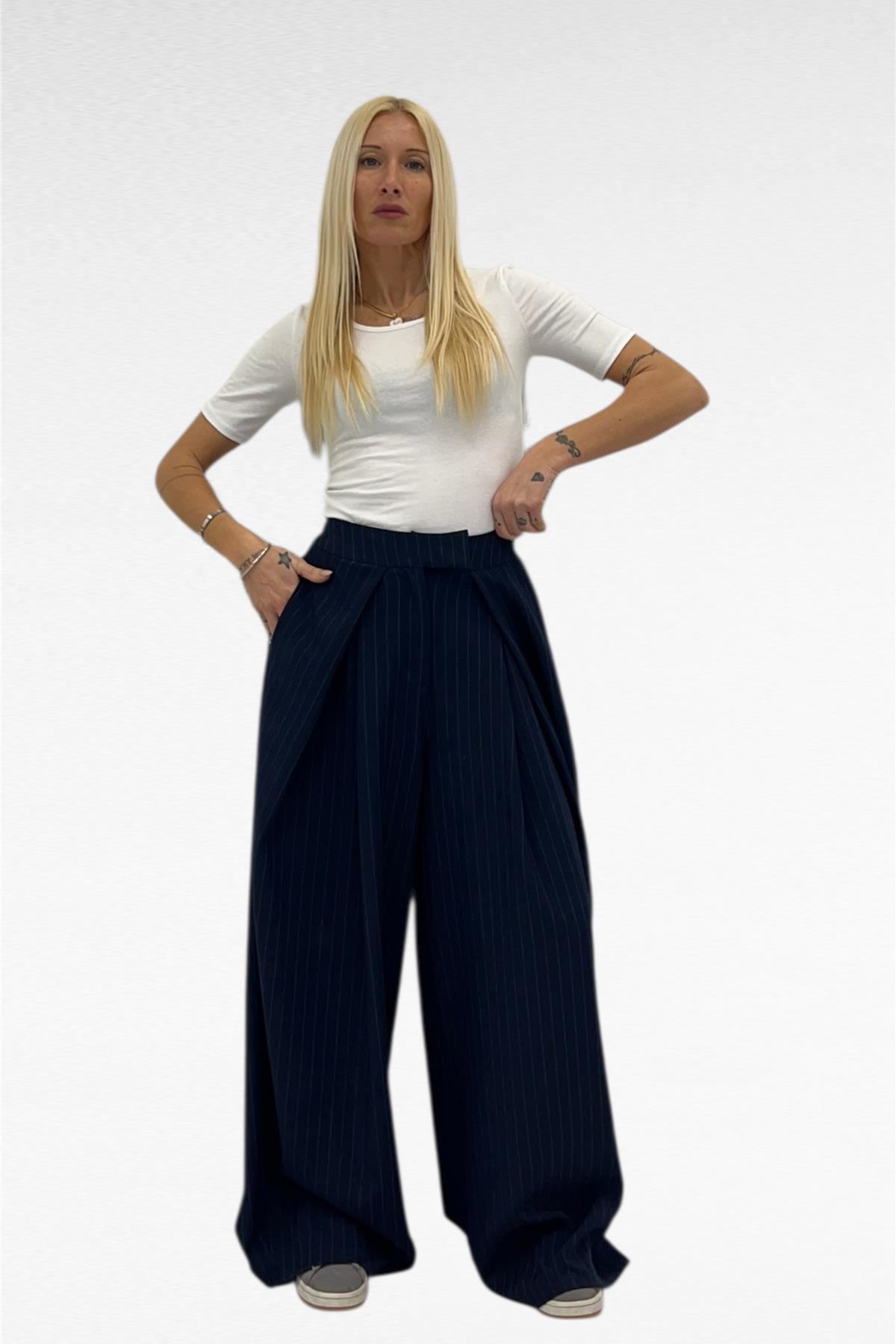 Pantalone modello palazzo base blu leggera gessatura bianca con pence effetto portafoglio, elastico in vita sul retro,sul davanti doppio bottone di chiusura a scomparsa.