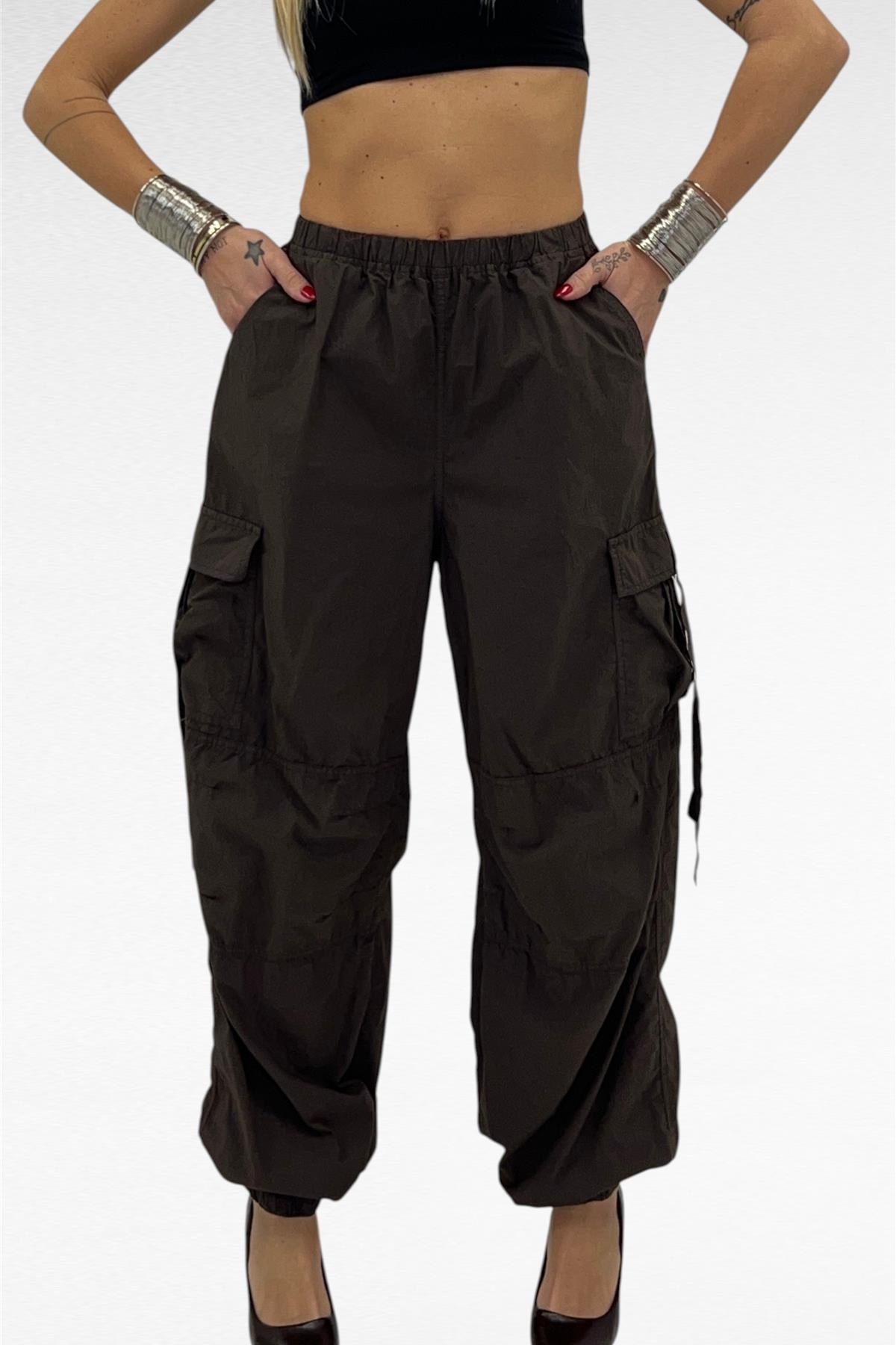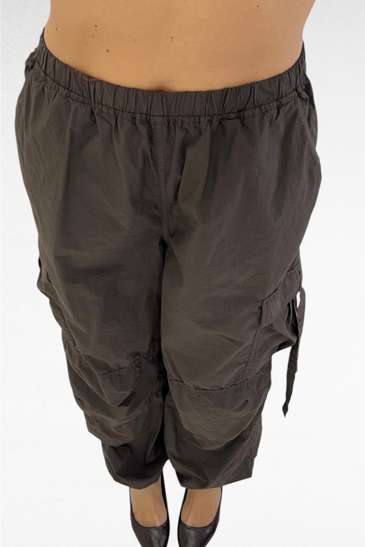 Pantalone modello cargo con tasche laterali reali , elastico in vita e sul fondo